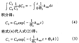 CFSTR反應器的物料平衡方程為: V2(dC2)dt=QC1-QC2 (1) 式中 C1——PFR中4BS出水濃度 C2——CFSTR中4BS的濃度 Q——循環流量 對于PFR,有: C1=C2exp(-Θ1k) (2) 式中 k——PFR中4BS降解脫色速率常數 Θ1=V1/Q——4BS在PFR中的停留時間 將式(2)代入式(1)得: dC2/dt=-(1/Θ2)[1-exp (-Θ1k)]C2=-(1Θ2)kappC 2 (3) 式中 Θ2=V2/Q——4BS在CFSTR中的停留時間 令C0和C2分別代表t=0和t=t時4BS在CFSTR中的濃度,根據式 (3)可得: