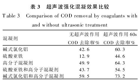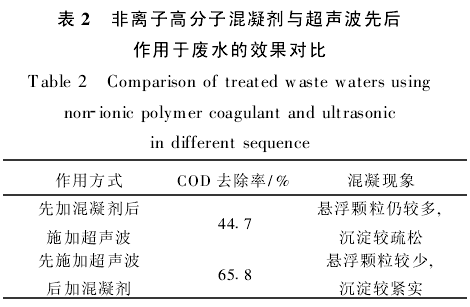 在制革加工過程中,脫脂、脫毛、軟化、染色和加脂等工序所產生的廢水中含有大量的有機物,一般未經處理的制革綜合廢水中COD值可高達4000mg/L~6000mg/L.目前,國內外制革廠處理制革廢水有機物的方法主要有生物法和混凝固液分離法,將超聲波技術應用于制革廢水處理的研究還未見報道.實際上,近年來國內外已有一些將超聲波技術應用于水污染控制方面的報道,如超聲強化處理高濃度有機廢、超聲降解水體中的環狀有機污染物、農藥類物質、酚類等.研究表明,超聲降解水體中的化學污染物,可單獨或與其它水處理技術聯合使用,是一種極具發展潛力的水處理新技術.本文探索超聲波技術結合混凝沉淀法處理制革廢水中有機物的強化途徑和處理條件.1 實驗部分1.1 實驗儀器 TC型高溫高聲強超聲波儀(成都市九洲機電工程研究所);攪拌器.1.2 實驗的試劑及水樣 堿式氯化鋁(工業級),硫酸亞鐵(工業級),非離子型高分子混凝劑(本實驗室自制).實驗用廢水取自四川溫江科嘉制革廠的綜合廢水.1.3 實驗方法 (1)超聲波作用條件 所用超聲波儀聲強為1.47W/cm2,頻率為24kHz.每個廢水樣400ml,超聲波作用于廢水的時間分別為10s、30s、60s、600s、1200s、1800s、3600s、5400s、7200s,測定超聲波作用后廢水的和混凝劑的混凝作用,控制超聲波作用最長時間為1800s. (2)混凝沉淀法處理廢水 選擇不同的混凝劑單獨使用或混合使用處理廢水,混凝劑濃度為1%,每個廢水樣為400ml,分別加入0.5ml、1ml、2ml、4ml、6ml、8ml混凝劑,相當于樣液中混凝劑濃度分別為12.5mg/L、25mg/L、50mg/L、100mg/L、150mg/L、200mg/L,快速攪拌10min,靜置2h,取上層清液測定COD值. (3)強化混凝沉淀時超聲波施加方式的選擇 400ml廢水中加入1%的非