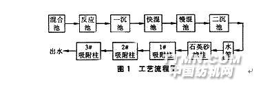 1.3 混凝沉淀試驗 采用兩個混合池交替使用,先在混合池中加石灰調pH值在12左右,再投加Xp2500mg/L,然后流入反應池,反應池出水進入一沉池沉淀,一沉池出水進入快混池,于快混池中加入石灰調整pH至12左右,快混池出水進入慢混池,再投加Xp2500mg/L,慢混池出水進入二沉池沉淀。?1.4 吸附試驗 靜態試驗采用燒杯試驗的方法:取若干個燒杯,加入一定量的二沉池出水,再投加活性炭,在DBJ—621定時變速攪拌機上進行攪拌,時間為2h,待攪拌結束后,取下靜置,取上清液過濾后測定其CODCr值。動態試驗水樣靜置后,直接取上清液測定。? 動態試驗中為了使吸附裝置進水水質保持相對穩定,二沉池出水混合后經砂濾柱再進入活性炭吸附柱,其中活性炭吸附采用三柱串聯方式。?