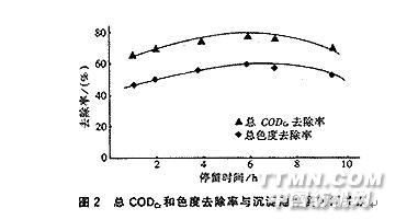 2.1 混凝沉淀2.1.1 混合前的自然沉淀 由于三種廢水水質極不穩定,故在混合前分別于三個調節池中進行自然沉淀,一方面可穩定水質,去除一部分CODCr及色度,另一方面可回收廢水中所含的有用物質,達到回收與處理兼顧的目的。染料廢水自然沉淀隨時間變化情況如表4。