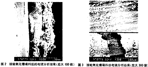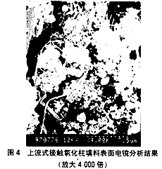 ② 從兩種膜生物反應器對COD、色度、SS以及濁度的去除情況來看,生物單元出水隨進水水質變化產生波動,而膜單元出水水質均較穩定。 ③ 從SS去除情況可以看出,每隔264h左右接觸氧化槽的處理效率會出現一個由最低到最高再回到最低的變化過程,同時由生物單元對COD的去除率變化也可看出這一趨勢。生物單元出水COD升高主要是由出水SS升高引起的,在COD去除率處于低值時出水SS達到最高值。由于膜單元的截留作用使膜生物反應器對COD的總去除率基本穩定在80%以上。COD去除率的周期變化與固定生物膜的生長周期密切相關,當COD處理效率處于上升階段時填料絲上生物膜的氧及營養物的傳質情況良好,此時生物膜生長速度超過了脫落速度,生物膜處于高活性狀態,因而對廢水中的污染物有較高的去除率,表現出COD去除率上升。隨著細菌大量生長、膜厚增加,此時內層膜處于內源呼吸階段,經過一定時間后內層的營養物耗盡,生物膜的完整性遭到破壞,同時產生的厭氧氣體在內層把膜頂起,使生物膜發生大塊脫落并露出新鮮的填料表面,完成了一個生物膜生長周期。脫落的生物膜隨水流從生物反應器排出,又被機械膜截留返回生物池。 接觸氧化槽運行696h的填料絲電鏡分析結果分別見圖2、3。