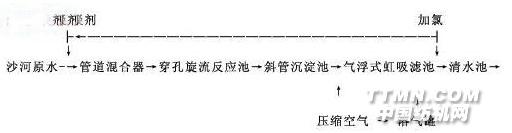 河南省某水廠建于1990年,取沙河水(屬淮河流域),處理流程為:原水–穿孔旋流絮凝池–斜管沉淀池–虹吸濾池–液氯消毒–管網