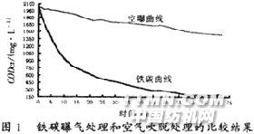 2.1.2 鐵碳曝氣處理試驗 直接將印染—堿減量混合污水置于由等體積鐵屑、焦碳組成的鐵碳反應池中進行曝氣處理試驗。圖1是相同試驗條件下該混合污水經鐵碳曝氣處理和僅經空氣吹脫處理的比較結果。圖1結果表明:在長達72h的處理過程中,鐵碳曝氣處理可使混合污水CODCr去除率達到90.5%,其中前14hCODCr去除速率較快,而直接空氣曝氣吹脫處理實際去除率很低。 另外,經過鐵碳預曝氣處理,污水中TA的去除與總CODCr的去除結果基本一致。這表明采用鐵碳曝氣作為預處理手段,也可有效降低后續生化的處理負荷。