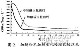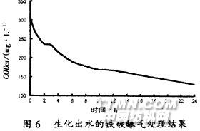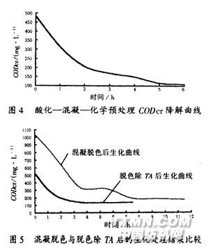 圖4是混合污水經酸化—化學混凝預處理后污水的生化降解曲線。結果表明:經化學混凝處理的出水繼續進行生化處理,可以做到達標排放。