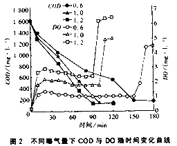為了實(shí)現(xiàn)以DO作為SBR法運(yùn)行過(guò)程中曝氣量及反應(yīng)時(shí)間的模糊控制參數(shù),必須尋找DO與有機(jī)物降解之間的規(guī)律性。因此,本試驗(yàn)在兩種不同條件下研究DO濃度對(duì)反應(yīng)過(guò)程的影響。2.1 同一進(jìn)水濃度不同曝氣量 試驗(yàn)配制原水COD濃度為1800mg/L,進(jìn)水混合后反應(yīng)初始COD濃度為1600mg/L。反應(yīng)過(guò)程平均MLSS=2000 mg/L,曝氣量分別為