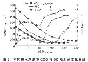從圖中可以看出,反應(yīng)開(kāi)始8~10min左右,不同曝氣量下DO值顯著不同。曝氣量越小,此時(shí)的DO值越低,致使整個(gè)反應(yīng)過(guò)程DO處于較低水平,大大延長(zhǎng)了反應(yīng)時(shí)間。隨著曝氣量的增大,初始DO值也在增大,帶來(lái)整個(gè)反應(yīng)過(guò)程DO的提高,縮短了有機(jī)物達(dá)到難降解程度的時(shí)間,即減少了反應(yīng)時(shí)間。但是,過(guò)分地增大曝氣量,初始DO的過(guò)高會(huì)造成整個(gè)過(guò)程DO處于過(guò)高的水平,卻不能有效地縮短反應(yīng)時(shí)間,還造成能量的巨大浪費(fèi)。產(chǎn)生這種現(xiàn)象可以從耗氧速率與DO的相關(guān)關(guān)系的研究中得到解釋,因?yàn)樵诘虳O濃度下,DO濃度對(duì)生化反應(yīng)速率的影響較大。當(dāng)DO在1~2mg/L范圍內(nèi),隨著DO的提高,耗氧速率大幅度提高,標(biāo)志著有機(jī)物降解速率的加快,從而縮短反應(yīng)時(shí)間。當(dāng)DO超過(guò)2mg/L后,繼續(xù)增大DO值,由于受污泥濃度(MLSS)的限制,有機(jī)物降解速率的增加幅度較小。? 取進(jìn)水COD濃度分別為400、600、800、1000、1