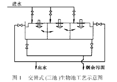 UNITANK工藝又稱一體化活性污泥法(交替生物池),是1987年,比利時SEGHERS公司提出一種新穎的活性污泥法。它由三個矩形池組成,三個池水力相連通,每個池中均設有供氧設備,可采用鼓風曝氣或采用表面曝氣,在外邊兩側設矩形池,設有固定出水堰及剩余污泥排放口,該池既可作暴氣池又可做沉淀池,中間一只矩形池只做曝氣池。進入系統的污水,通過近水閘控制可分時序分別進入三只矩形池中任意一只池。如圖1。