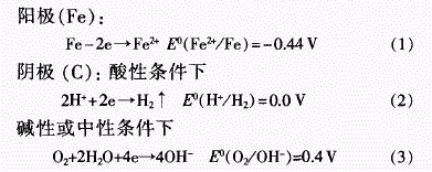 程春民(同濟大學環境科學與工程學院污染控制與資源化研究國家重點實驗室,上海200092)[作者簡介]程春明(1975-),同濟大學環境科學與工程管理在讀博士生。研究方向為生物化學與化工。E-mail:Cheng_chunmin@163,com.[摘要]印染廢水水質變化大、色度高,直接生物處理難度大,單一生化處理工藝難以達到排放要求。采用鐵屑內電解一生化工藝對浙江某印染廠廢水處理系統進行改進,內電解預處理大大提高了廢水的可生化性,最終生化段出水COD。去除率達到90%,色度去除率達到95%以上。鐵屑內電解一生化工藝具有處理效果好、出水水質穩定、設備簡單、操作管理方便、能耗低等特點,是處理印染廢水的有效方法之一。[關鍵詞]印染廢水;鐵屑內電解法;脫色隨著染料工業的迅速發展.目前全世界使用的染料品種已達數萬種。印染廢水主要含有染料、漿料、助劑、油劑、酸堿、纖維雜質及無機鹽等,具有成分復雜、濃度高、色度高、難降解等特點[1]。鑒于單一生化處理工藝難以使廢水達到排放要求.筆者采用鐵屑內電解一生化工藝對某印染廠廢水原處理工藝(水解酸化一好氧)進行改進。1鐵屑內電解原理鐵屑內電解法處理印染廢水是絮凝、吸附、架橋、卷掃、共沉淀、電沉積、電化學還原等綜合作用的結果[2、3]。1.1電化學還原作用鐵屑內電解法是利用鐵屑中的鐵和碳(或加入的惰性電極)組分構成微小原電池的正極和負極.以投加的廢水為電解質溶液。形成原電池.發生氧化還原反應,從而去除污染物的方法。新生態的電極產物活性高.能與水中的多種有機污染物發生氧化還原反應,使其結構、形態發生變化。完成由難處理到易處理、由有色到無色的轉變。鐵屑內電解法在其工作過程中,發生式(1)、(2)、(3)反應。.gif)