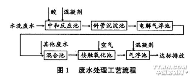某染料化工廠年產鈷酞菁類染料500t,在生產過程中排放鈷酞菁水洗廢水、染料水洗廢水及各車間的工藝沖洗廢水。廢水中含有多種染料中間體及大量無機原料,其中最主要的成分為N-N二甲基丙二胺和鉆離子。該廢水具有污染物濃度大、色度高、可生化性差等特點,在研究過程中,對混和廢水進行了多次試驗,包括電解氣浮法、化學氧化法、活性炭吸附法、好氧生化法、混凝沉淀法等。試驗結果表明采用電解法對鉆酞青廢水進行預處理有明顯效果,主要表現在CODcr大幅度下降,BOD5與CODcr的質量比從0.05上升到0.33,提高了廢水的可生化性。經過工程實踐證明,運用電解法對鈷酞菁廢水進行預處理,在后續工段采用生化、物化處理,可使該廢水經處理后達到國家二級排放標準。 1 廢水的水質、水量及排放標準1.1 廢水的水質、水量 鈷酞菁混合廢水的水質、水量見表1。| 表1 鈷酞菁混合廢水的水質、水量 | ||||||