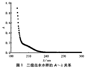 1.1 測定方法 采用UV-2501PC紫外分光光度計測定水樣的紫外吸光度數值(A)。 采用重鉻酸鉀方法測定水樣的COD值[3]。1.2 紫外吸收波長的確定 圖1是將二級出水水樣稀釋25倍的A~λ關系。