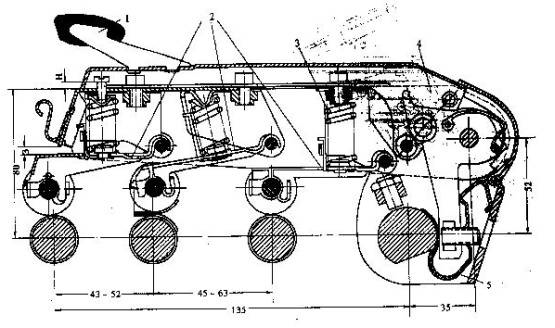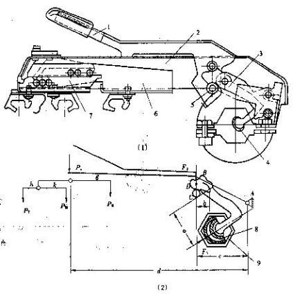 1-手柄 2-加壓桿 3-加壓彈簧 4-搖架體 5-搖架座