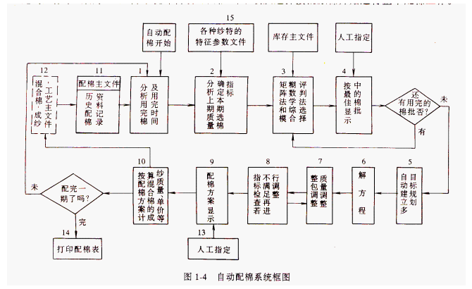3.自動配棉子系統(tǒng)本系統(tǒng)的主要功能是根據(jù)保證質(zhì)量、穩(wěn)定生產(chǎn)和降低成本等配棉工作的基本要求,選用最佳的接替棉批,確定成分百分比,完成配棉進(jìn)度表,它是計(jì)算機(jī)配棉的核心,其具體功能和工作程序如圖1-4所示。圖中虛線表示與另兩個(gè)子系統(tǒng)有聯(lián)系的功能模塊。