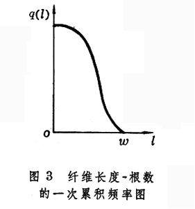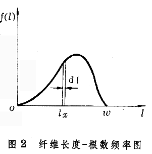 表示纖維長(zhǎng)度分布情況的坐標(biāo)圖。將一束纖維的根數(shù)按長(zhǎng)度分組計(jì)量,以橫軸表示束纖維長(zhǎng)度□,縱軸表示纖維的根數(shù)百分率f(□),作坐標(biāo)圖。當(dāng)分組的組距很小時(shí),畫(huà)成的圖形再加以修勻。畫(huà)出的連續(xù)曲線,稱為纖維長(zhǎng)度-根數(shù)頻率圖(圖2纖維長(zhǎng)度-根數(shù)頻率圖)。圖中o為起始點(diǎn),□為最長(zhǎng)纖維長(zhǎng)度,曲線下所含的面積□代表纖維的總根數(shù),□代表長(zhǎng)度為□□以上的纖維根數(shù)。