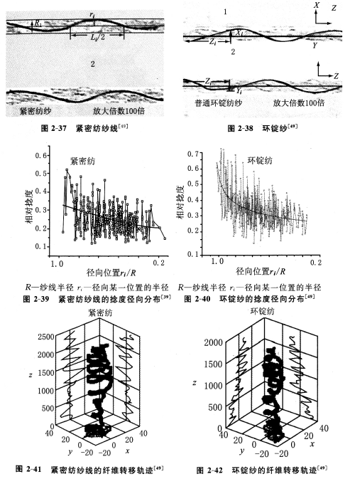 圖2—37和2—38給出了示蹤纖維在緊密紡紗線和環錠紗中的軌跡。圖2—37中,ri表示示蹤纖維波峰/波谷處的徑向位置;Li/2表示示蹤纖維在徑向位置ri處的半螺距。圖2—38中,X/,yi和Zi表示i點的空間坐標位置。圖2—39和2—40給出了緊密紡紗線和環錠紗的捻度徑向分布。兩種紗線的捻度都是沿著紗線徑向由內向外逐漸增大,而且紗線的軸心線都不存在捻度。然而,緊密紡紗線的捻度徑向分布曲線較為平滑,其纖維的內外轉移程度也低于環錠紗。