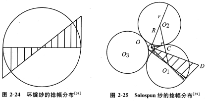 程等人[37-38]論述了SolospunTM的加捻機理。傳統環錠紡的加捻機理為:牽伸區輸出的纖維須條呈扁平狀,幾乎所有的纖維都平行于須條軸線;在捻度作用下,須條寬度開始逐漸減小而形成一個加捻三角區;最終,須條被捻成環錠紗(見圖2—22)。SolospunTM的加捻機理為:牽伸須條在SolospunTM羅拉的細小溝槽作用下,被分劈成兩到三根(甚至四根)子須條;每根子須條各自初步加捻并形成較小的加捻三角區;最后,每根子須條離開SolospunTM羅拉,一起加捻而形成SolospunTM紗。這一加捻機理使SolospunTM紗具有類似于多股紗的特殊結構(見圖2—23)。