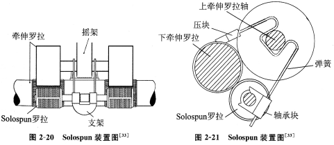 如圖2—19和2—20所示,SotospunTM的附力口裝置由一對固定于支架上的羅拉組成。該支架夾持在前羅拉的軸上。每個支架都有彈性,一端裝有一個壓塊,另一端為SolospunTM羅拉軸承。支架的鉗口通過壓塊推力固套在前羅拉軸上(圖2—21)。