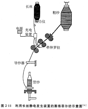 利用長絲靜電發生裝置來制備復合紗。這種方法能改善利用賽絡菲爾紡技術且由長絲和短纖維制成的復合紗的耐磨性,如圖2—11所示。基于雙電極系統原理,長絲充電裝置由一對中空圓電級組成,即頂部電極和底部電極(黃銅制)。連續長絲首先與頂部電極接觸而充電。由于它們帶有同性電荷,因而組成紗線的單絲相互排斥。同時,由于位于電極之間的電場作用,帶電長絲和底部電極之間相互吸引,增強了長絲向外拉開而成為氣泡狀的趨勢。