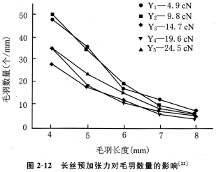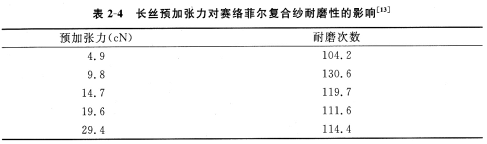 余[23]研究并測試了不同長絲預加張力下賽絡菲爾精梳毛紗的毛羽和耐磨性,紗線線密度22.7tex,設計捻度1004捻/m。圖2—12表示長絲預加張力為4.9~29.4cN時對賽絡菲爾復合紗毛羽的影響,預加張力為9.8~14.7cN時,毛羽最少。表2—4表示長絲預加張力為4.9~29.4cN時對賽絡菲爾復合紗耐磨性的影響,長絲預加張力為9.8—14.7cN時,賽絡菲爾復合紗的耐磨性最佳。