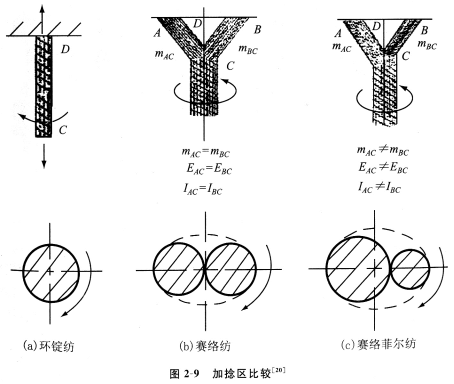 賽絡菲爾紡中,一根長絲和一根短纖維粗紗分別喂入,并與前牽引羅拉握持點之間保持一固定距離(如圖2—8所示),它們組成三角區,一起加捻而形成賽絡菲爾復合紗。