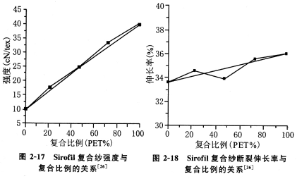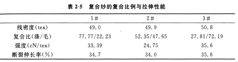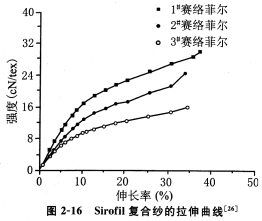 陳[26]等研究測試了賽絡菲爾復合紗的拉伸性能。表2—5列出了三種滌綸長絲和羊毛復合比例各不相同的賽絡菲爾復合紗及其拉伸性能。圖2—16所示為三種賽絡菲爾紗的拉伸曲線。圖2—17和2—18則描述了紗線強度、斷裂伸長率與復合比例之間的關系。滌綸長絲和羊毛的復合比例對賽絡菲爾復合紗的拉伸曲線、強度和斷裂伸長率都有影響,隨著滌綸長絲比例增加,紗線強度增加。