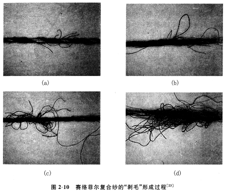 如圖2—9所示。對于傳統環錠紡,由一根短纖維須條加捻成紗;對于賽絡紡,采用兩根短纖維須條加捻成紗,兩須條的質量、模量和轉動慣量均相同;但賽絡菲爾紡中,由一根短纖維須條和一根長絲加捻成紗,且須條和長絲的質量m、模量正和轉動慣量/是完全不同的。因此,對須條和長絲同時加捻是不穩定、不平衡的。就羊毛與滌綸或錦綸長絲紗的賽絡菲爾紗而言,由于后道加工中的各種摩擦作用,長絲和羊毛容易分離;進而,羊毛從紗體中分離,稱為“剝毛”(圖2—10),這必定影響織造效率和織物外觀。因此,需要對須條或長絲的張力和扭矩進行補償,以改善“剝毛”現象。