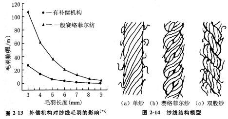 余[23]還研究了賽絡菲爾紡紗過程中的張力和力矩補償機構。圖2—13表示加裝補償機構對賽絡菲爾復合紗毛羽的影響。當預加張力為14.7cN時,應用補償機構,賽絡菲爾復合紗的毛羽明顯減少。