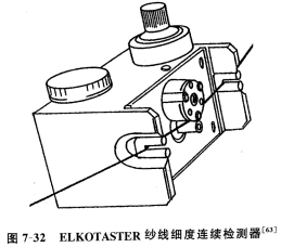 變形紗的粗細(xì)、糾纏和線圈也可用探頭和其他電子原件實施在線檢測。Textechno開發(fā)了這種探頭,商品名為ELKOTASTER[63](圖7—32)。該探頭可連續(xù)檢測紗線粗細(xì)并將信號送給控制單元。如果紗線粗細(xì)超過預(yù)先設(shè)定的水平,機器會發(fā)出警報,或者停機。
