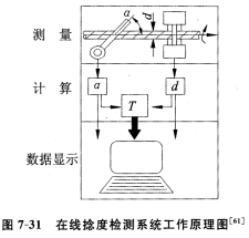 為了測量紗線捻回角,開發(fā)了一種測量裝置。為了減小摩擦和磨損,該裝置使用刀片或一個很小的陶瓷銷,另外采用一種很小的激光傳感器來測量紗線的直徑[61]。如圖7—31所示為紗線的捻度在線檢測系統(tǒng)。