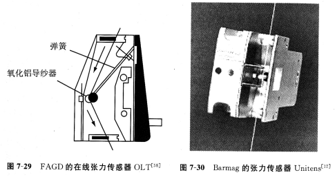 圖7—29表示FAG的在線張力傳感器OLT[58],圖7—30為Barmag開發(fā)的張力傳感器[12],這是目前兩種最主要的紗線張力在線測量裝置。