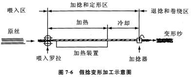 如圖7—5(c)所示,如果在喂入羅拉和加捻裝置之間安裝一加熱裝置,則復(fù)絲在加捻狀態(tài)下經(jīng)熱定形(圖7—6)而形成三維螺旋卷曲。在加熱裝置后,復(fù)絲在進入加捻裝置之前冷卻。