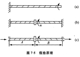 如果握持復(fù)絲的一端,另一端旋轉(zhuǎn)加捻,則得到真捻,如圖7—5(a)所示。可以想象,如果握持復(fù)絲的兩端,并在復(fù)絲兩端的中間通過加捻裝置進行加捻,復(fù)絲則在加捻裝置的兩端得到捻向相反、數(shù)目相同的捻度(圖7—5(b)):一端為S捻,另一端為Z捻。而整根紗線的捻度之和為o。如果加捻裝置連續(xù)旋轉(zhuǎn)加捻,同時復(fù)絲往前運動,則紗線在月區(qū)退捻(圖7—5(c))。當整個系統(tǒng)達到平衡狀態(tài)時,輸出的紗線上沒有捻度。因此,結(jié)果是紗線在喂入側(cè)(A區(qū))加捻,在輸出側(cè)(B區(qū))退捻。