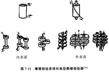 圖7—11所示為摩擦加捻原理和典型的摩擦假捻器。紗線穿過摩擦管的內表面或摩擦盤的外表面,通常為一組摩擦管或摩擦盤。摩擦管的內徑或摩擦盤的外徑比紗線直徑大得多,這意味著摩擦管或摩擦盤每轉一周可在紗線上形成若干個捻回(忽略紗線打滑)。因此,紗線能以較高的線速度喂入,而摩擦假捻器的回轉速度可相對較低。大多數情況下,紗線在張力作用下緊靠摩擦假捻器的摩擦面,由摩擦面的轉動在紗線上產生扭矩,因此形成捻度。但是,摩擦加捻的一個最大缺點是在加捻過程中會產生大量打滑,加捻效率只有50%左右。紗線與摩擦面之間打滑,會影響紗線捻度和加工張力。因此,與轉子式假捻器相比,摩擦假捻加工的變形紗卷曲不均勻。但是,由于摩擦假捻的加工速度高,因此,現在全世界使用最廣泛的是摩擦假捻裝置。