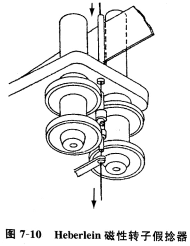 20世紀60年代后期至70年代早期,開發了磁性轉子假捻器,轉速高達80×104r/min。假捻小轉子安裝在兩個回轉的羅拉之間,并靠磁力固定。圖7—10所示為Heber-lein磁性轉子假捻器。