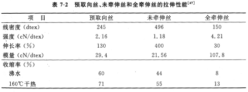 表7—2表示三種紗線的拉伸性能。預(yù)取向絲與未牽伸絲的取向度不同,因此紗線強(qiáng)度、伸長率和模量不同。預(yù)取向絲的高熱收縮率是因?yàn)樗∠蚨容^高而結(jié)晶度較低。