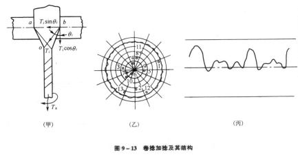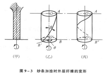 須條上獲得真捻后,其外層纖維便產生傾斜的螺旋線捻回,纖維扭轉變形,紗條緊密抱合,改變了纖維集體的結構形態和機械物理性質,如圖9-3(甲)所示。