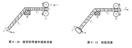 若在圖9-10中須條的喂入點A與加捻點C之間有一機件B與紗條接觸,由于B對紗條有摩擦阻力,在一定程度上阻止了捻回自C向A的正常傳遞,結果使T1<T2,B點的阻力越大,AB段的捻回越少,這種現象稱為捻陷,B為捻陷點。
