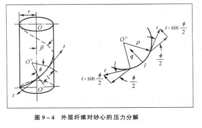 當對紗條存在包圍角時,纖維對紗條便有向心壓力,包圍角越大,向心壓力越大。由于向心壓力的存在,使外層纖維向內層擠壓,增加了紗條的緊密度和壓力越大。由于向心壓力的存在,使外層纖維向內層擠壓,增加了紗條的緊密度和纖維間的摩擦力,從而改變了紗條的結構形態及其物理機械性質,這就是真捻成紗的實質。