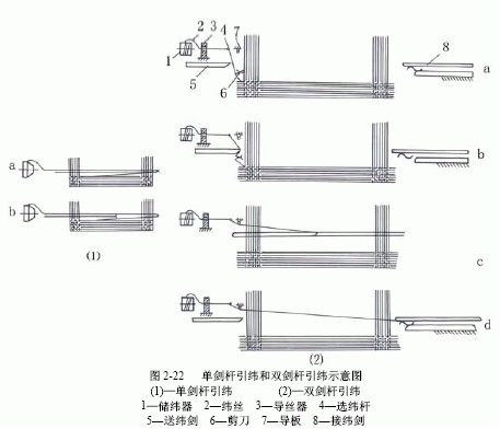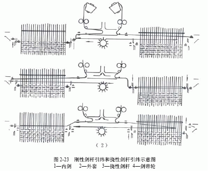 單劍桿引緯是由一根劍桿將緯絲從梭口的一側引導到另一側,如圖2-22(a)所示。這種引緯形式比較容易實現,但劍桿引緯時間只占了劍桿在梭口中運動的一半時間,因此,單劍桿引緯只適用于狹幅織物(如:帆布、帶織物及領帶綢等)的加工。