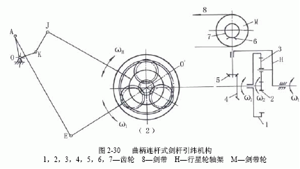 如圖2-30所示為曲柄連桿式劍桿引緯機構示意圖。六連桿送緯劍桿引緯機構如圖2-30(1)所示,主軸O轉動,分別帶動六連桿機構和四連桿機構的曲柄OA、OK,經桿件分別往復傳動周轉輪系中的齒輪1和行星輪軸架H,在齒輪1和行星輪軸架H的作用下,齒輪2作往復轉動,并通過傘齒輪4、5、6、7帶動劍帶輪M往復回轉,從而使劍帶8作往復直線運動,完成劍桿的引緯工作。