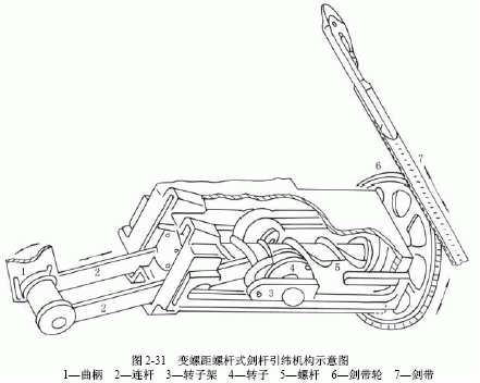 如圖2-31所示為變螺距螺桿劍桿引緯機構示意圖
