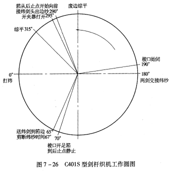 C401S型劍桿織機生產粘纖細布時的工作圓圖如圖7-26所示,織物的規格為19.7tex×19.7tex,267.5根/10cm×267.5根/10cm,160cm。