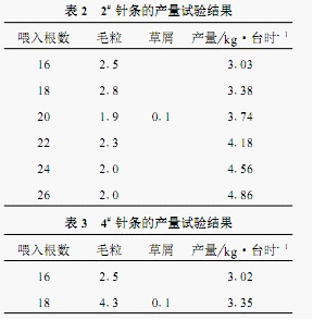 取2#和4#2套能達到質量要求的針條,在其他條件不變的情況下,改變喂入根數,做提高產量的試驗。2#針條和4#針條的試驗結果分別見表2和表3。