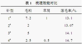 從上表可看出,1#針條因密度較小,故去除毛粒等雜質的能力較差,毛粒含量超標,達不到生產要求。3#針條因角太大,對纖維的穿透力和握持力均較小,也達不到生產要求。而2#和4#針由于針的密度較大,且對毛層的穿透力較強,故毛粒含量較少,產品質量能夠達到要求。