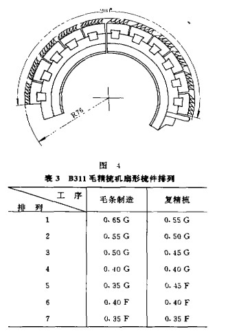 根據不同型號精梳機的設計要求,其圓梳弧面角可隨扇形梳件的塊數而變。如圖3是145。,采用8塊扇形梳件(粗3、細5);圖4是2OO。,采用lI塊扇形梳件(粗6、細5)。前后排扇形梳件針號的排列原則與普通焊錫梳針相似,即從粗到細,表3是德方推薦用于B31I毛精梳機(精梳角度為127。)梳理64~66羊毛時,7塊扇形梳件的針號排列。