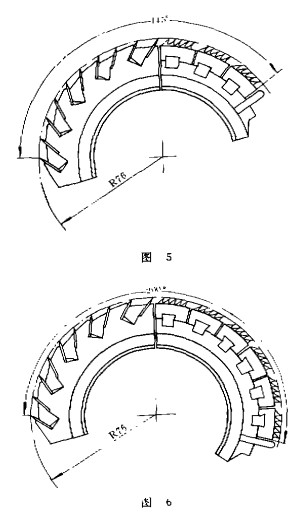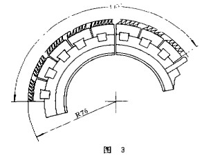 混合式整體錫林是針片式與針條式的結合。圖5、圖6是TNI公司提供的混合式整體錫林,其圓梳弧面角分別為145。(3塊粗扇形梳件,1O條針條)和200。(6塊粗扇形梳件,1o條針條)。