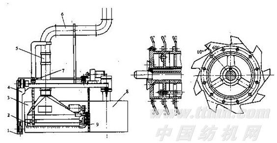 國產LFA001型開清聯合機用于加工含雜率為3%~4%原棉。紡15tex紗時,除雜效率達65%左右,棉卷重量不勻率在1%以內。聯合機的組成如下: