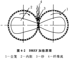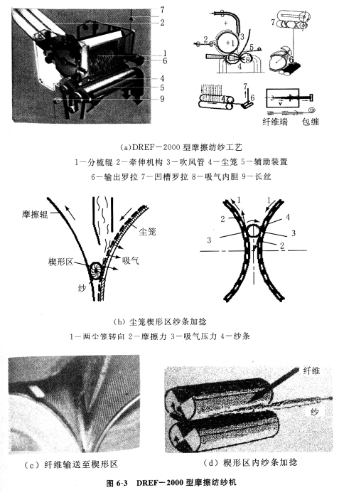 圖6—3為DREF-2000型摩擦紡紗機。一般是6根條子并列喂入,經三羅拉奉伸裝置低倍牽伸后,呈張緊的薄纖維層喂人分梳輥1,分梳成單纖維;在吹風管3的吹風氣流和一對塵籠4的吸氣氣流的共同作用下,被輸送到兩塵籠組成的楔杉區內,如圖6—3(b)、(c)、(d)。塵籠內有吸氣內膽8,在吸嘴抽氣的作用下,楔形區處形成負壓,纖維緊貼于楔形區塵籠表面。在兩個同向回轉的塵籠所產生的摩擦力矩作用下(塵籠內膽固定不轉,吸口始終對準楔形區),紗條繞自身軸線回轉而加捻成紗。屬于自由端搓捻紡紗。