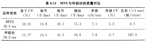 MVS紗除強(qiáng)度比環(huán)錠紗低(10%)及條干稍差以外,其他質(zhì)量指標(biāo)與環(huán)錠紗相當(dāng),毛羽則比環(huán)錠紗明顯減少(有時(shí)可減少95%)。紗的性能好,外觀光潔,耐磨性好,紗較蓬松,制成織物吸濕性好,洗滌快干,織物抗起毛起球性好。