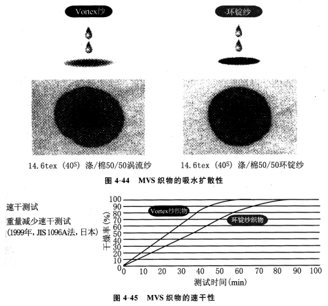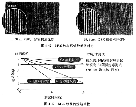 根據(jù)日本公司測(cè)試分析,圖4—41說(shuō)明噴氣渦流紗及其織物的各項(xiàng)性能與環(huán)錠紗及其織物比較的優(yōu)劣圖;圖4—42反映噴氣渦流紗與環(huán)錠紗對(duì)比的毛羽情況;圖4—43反映噴氣渦流紗織物的抗起球性;圖4—44和4—45反映噴氣渦流紗織物的吸濕速干性與環(huán)錠紗織物的對(duì)比。