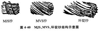 噴氣渦流紡MVS是自由端紡紗,紗的結(jié)構(gòu)和性能與噴氣紡紗(MJS)有明顯差異,但又不同于環(huán)錠紗。根據(jù)其特殊的成紗機(jī)理和實(shí)驗(yàn)分析,得出:噴氣渦流紗(MVS)的紗芯纖維狀態(tài)基本平行,約占紗的截面纖維總數(shù)的40%左右,它的形成與引導(dǎo)針棒引導(dǎo)須條中的部分纖維先進(jìn)入空心錠內(nèi)孔有關(guān);紗的主體,外部約占60%纖維,與環(huán)錠紗相似,呈螺旋線排列在紗體中。可以認(rèn)為噴氣渦流紗是由紗芯纖維基本平行無(wú)捻度(占40%)和紗主體纖維呈螺旋線捻回這兩部分組成。圖4—40為MJS、MVS、環(huán)錠紗結(jié)構(gòu)示意圖。表4—11為噴氣渦流紗與環(huán)錠紗質(zhì)量對(duì)比情況。